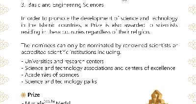 The Mustafa Prize, a top science and technology award, is granted biennially to the top researchers and scientists of the Islamic world in four categories: “Life and Medical Science and Technology”, “Nanoscience and Nanotechnology”, “Information and Communication Science and Technology”, and “Basic and Engineering Sciences”.