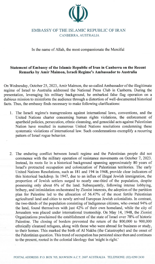Statement of Embassy of the Islamic Republic of Iran in Canberra