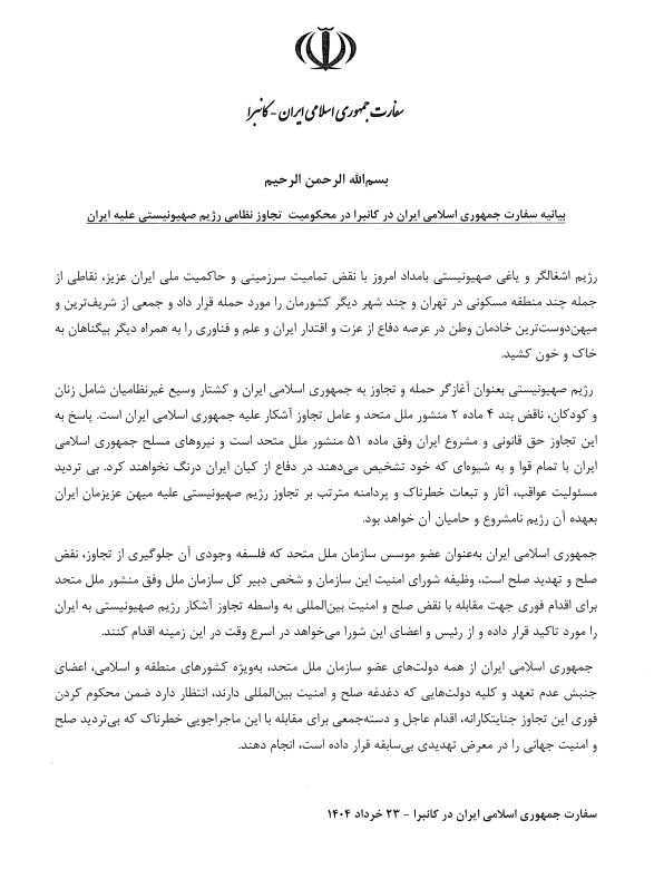 بیانیه سفارت جمهوری اسلامی ایران در کانبرا
